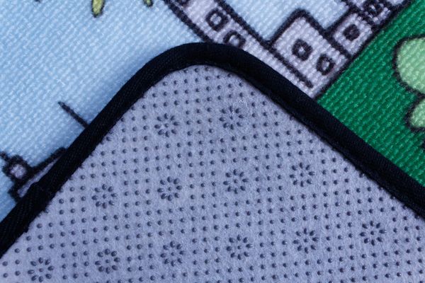 Der Teppich hat eine Größe von 80 x 50 cm und eine Gesamthöhe von ca. 5 mm. Die Grundfarbe ist Multi, wodurch die verschiedenen Straßen und Gebäude besonders lebendig wirken. Dank der Antirutsch-Rückseite bleibt der Teppich auch auf glatten Böden sicher an seinem Platz, sodass Kinder ungestört spielen können.