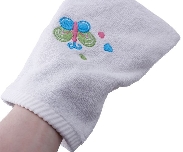 Hergestellt aus hochwertigem, weichem Frottee ist der Waschhandschuh besonders sanft zur empfindlichen Baby- und Kinderhaut.